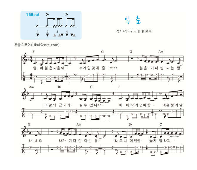 가요 교재 악보 948번 멜로디 악보입니다 전주 간주 멜로디 타브, 코드표, 리듬표가 첨부된 교재용 연습용 악보입니다 반주 악보를 보시려면 여기를 클릭하세요 입춘 (가요교재 947) 반주 > 악보 | 우쿨스코어 |