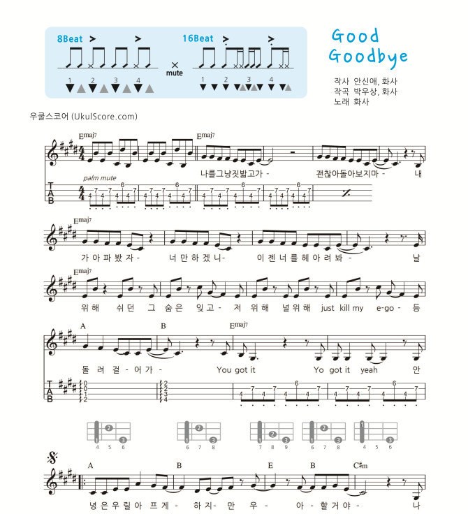 가요 교재 악보 955번 반주 악보입니다 전주 간주 반주 타브, 코드표, 리듬표가 첨부된 교재용 연습용악보입니다 하이코드를 연습할 수 있도록 코드표가 첨부되어 있습니다 멜로디 악보를 보시려면 여기를 클릭하세요 Good Goodbye (가요교재 956) 멜로디 > 악보 | 우쿨스코어 교재 문의 및 레슨문의 010-2247-1010 수원 싱글벙글 우쿨렐레 | ||