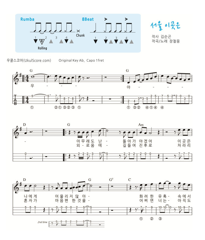 가요 교재 악보 964번 멜로디 악보입니다 전주 간주 멜로디 타브, 코드표, 리듬표가 첨부된 교재용 연습용 악보입니다 반주 악보를 보시려면 여기를 클릭하세요 서울 이곳은 (가요교재 963) 반주 > 악보 | 우쿨스코어 원곡은 Ab, 악보는 G키 입니다 원곡 음원에 맞추어 연습하시려면 카포를 1플렛에 꼽으시거나 어플을 이용해 음원을 반음 내리시면 됩니다 교재 문의 및 레슨문의 010-2247-1010 (수원 싱글벙글 우쿨렐레) | ||